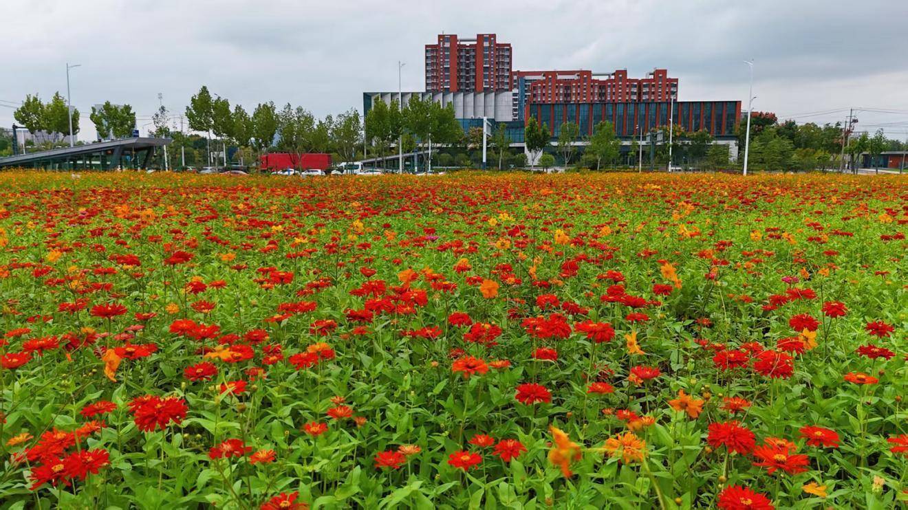 城市转角处的“色彩惊喜”。在望江西路与长宁大道交口、创新大道与彩虹东路交口等重点区域,总面积约21万平方米的硫华菊与百日草正绚烂绽放。金色、橙红与深红交织,宛如大自然打翻的调色盘,将曾经的闲置地块,绘成一幅热烈的秋日画卷。