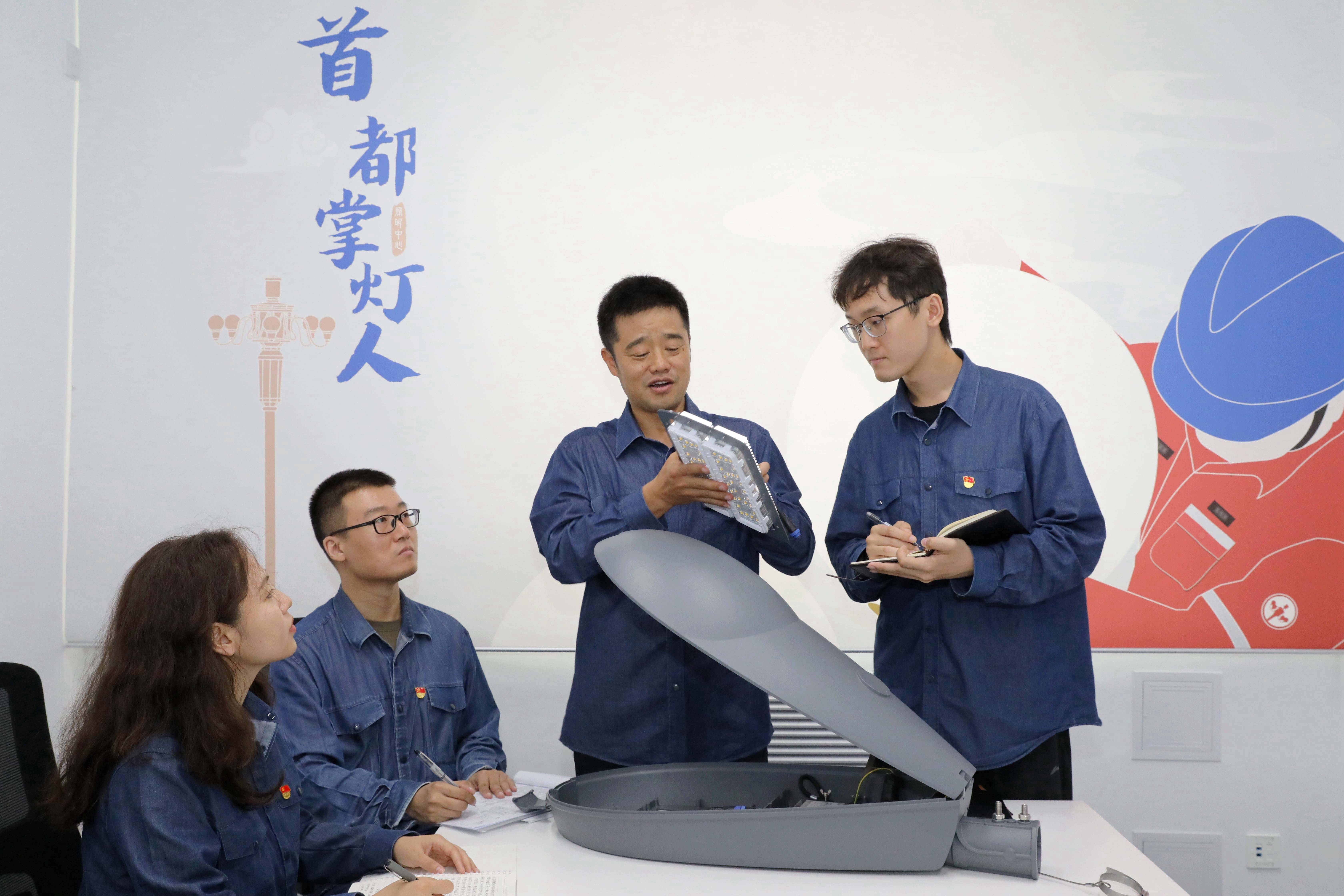在国网北京电力城市照明管理中心的陈春光创新工作室中,华灯班班长陈春光(右二)正在为青年职工讲解模组化LED路灯的专业知识。新华社发(张超 摄)夜更深了,长安街像是一条流淌的星河。