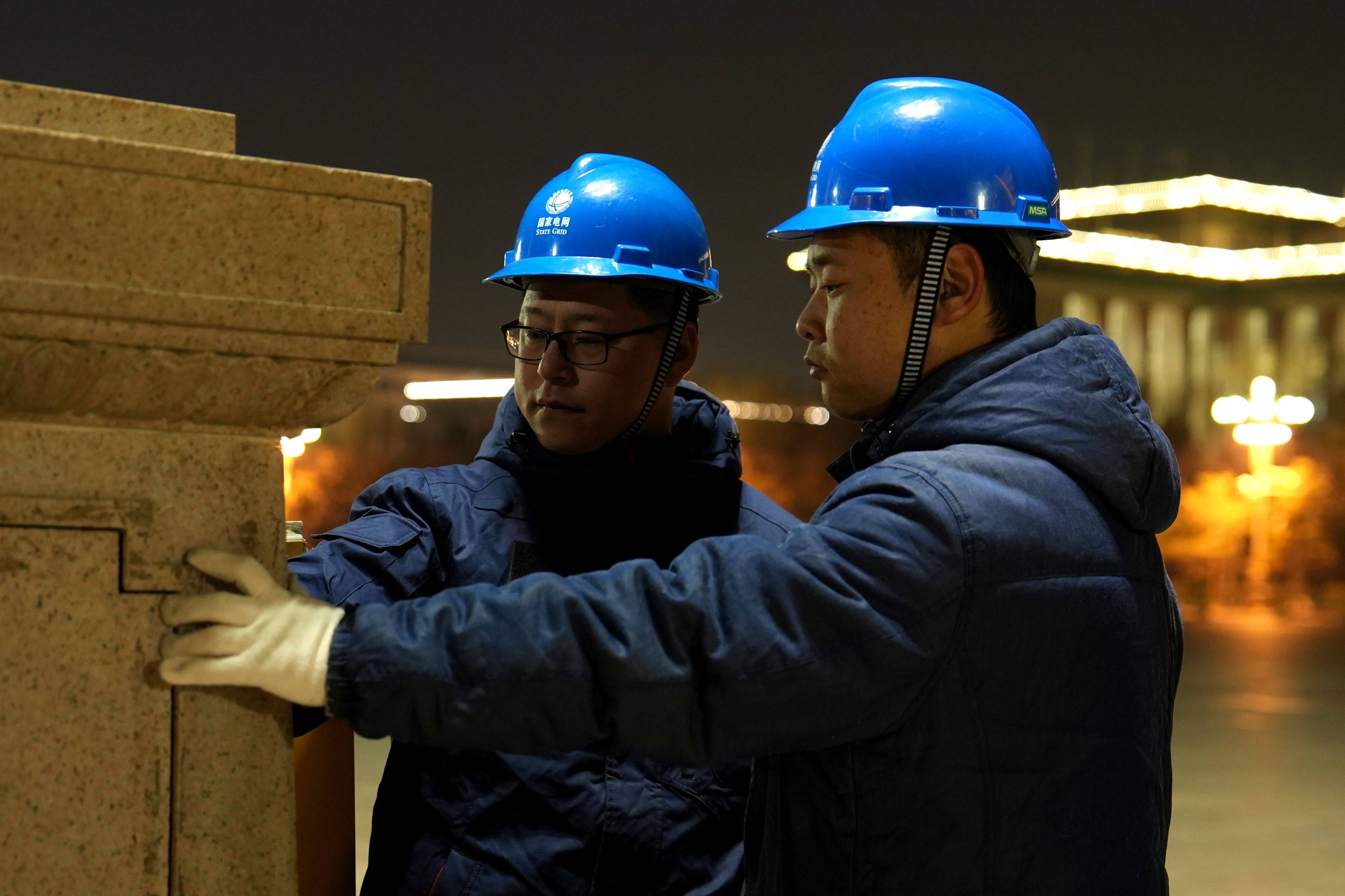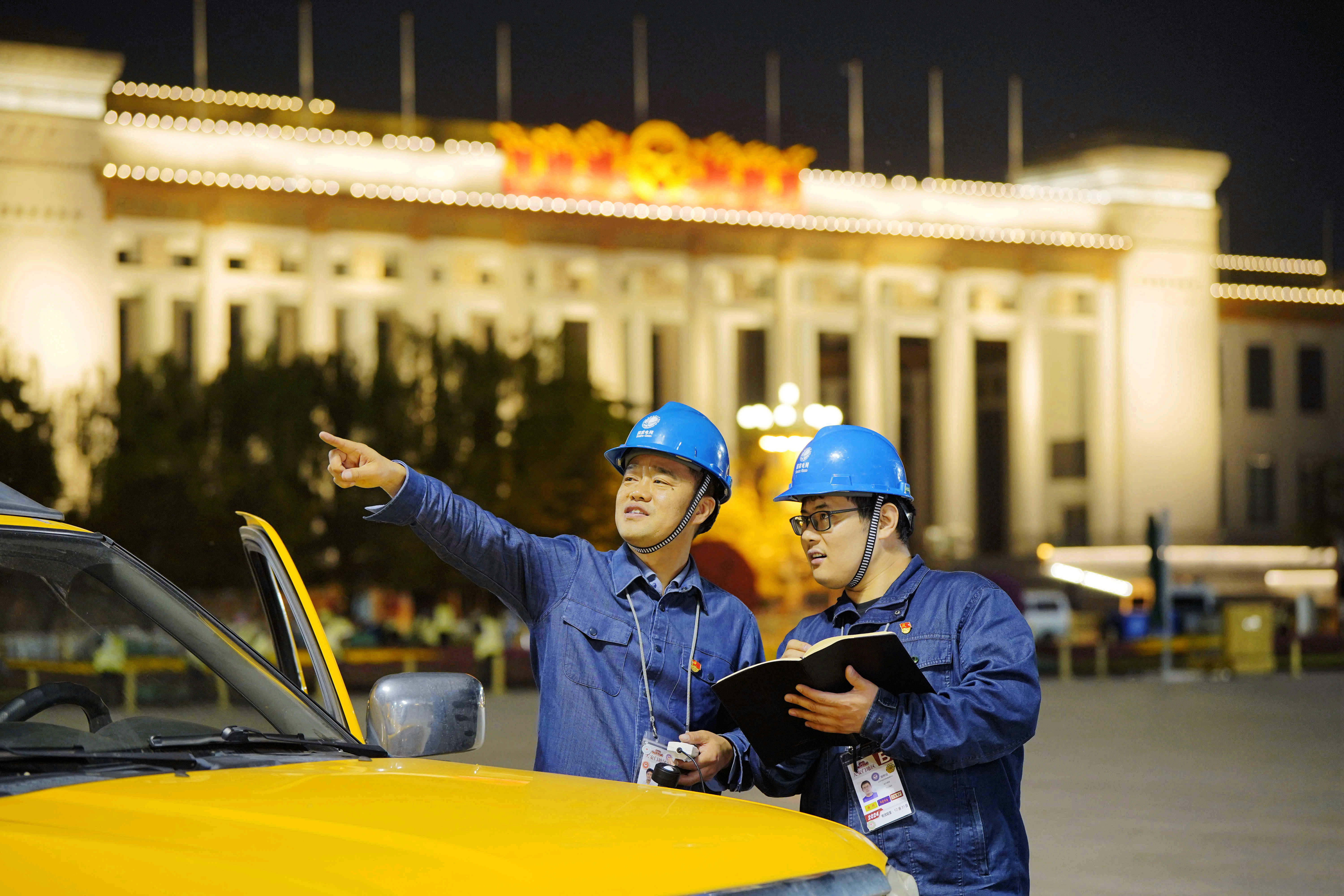 华灯班班长陈春光(左一)和工作人员正在天安门广场巡检华灯。新华社发(张超 摄)华灯,静静见证着北京城奔流不息的车水马龙,守护着千万人风里雨里的平安归途,而华灯的一次次换代升级,也折射了城市发展理念的绿色转型。