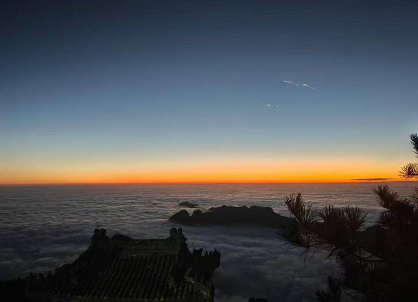此番景象的形成,得益于武当山独特的地理与气候条件。秋季昼夜温差加大,充沛的水汽在群山谷地间凝结,极易形成大规模、长时间的云海。与此同时,漫山遍野的秋叶正悄然变色与丹墙翠瓦相互映衬,构成一幅色调浓郁、层次分明的天然画卷,为壮丽的云海景观增添了灵动的色彩。