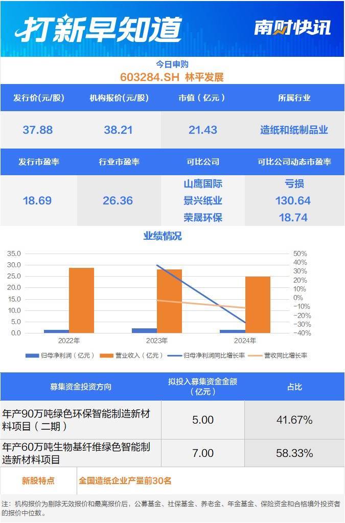 两只新股申购林平发展主要从事包装用瓦楞纸、箱板纸产品的研发、生产和销售,是一家具有自主研发及创新能力的高新技术企业。