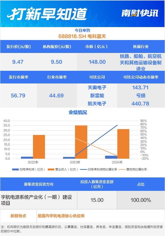 1月30日,可申购上交所的林平发展(603284.SH)和科创板的电科蓝天(688818.SH),另有一只新股上市,为北交所的美德乐(920119.BJ)。