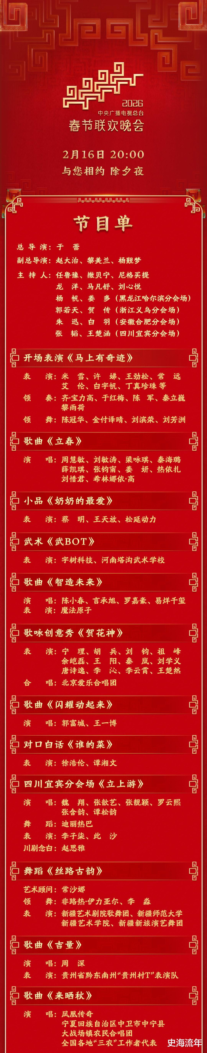 2026年央视马年春节联欢晚会,在万众期待中揭晓了最终的节目安排。与往年相比,今年春晚在演员阵容、节目形式与艺术选择上呈现出若干令人耳目一新的显著亮点。