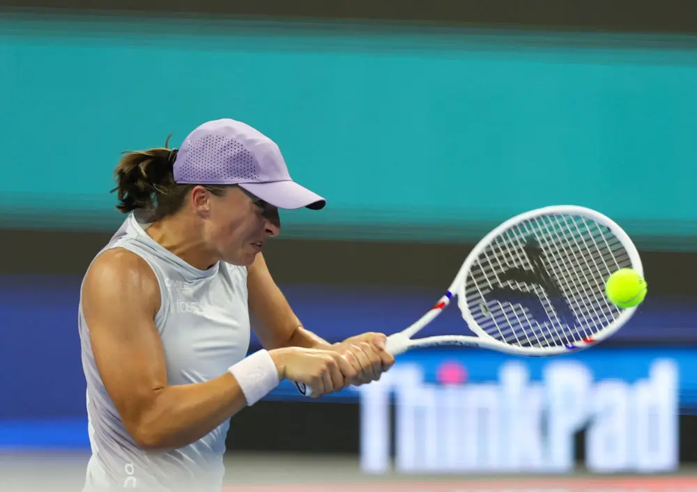 10月1日,斯维亚特克在比赛中回球。新华社记者 杜昕怡 摄