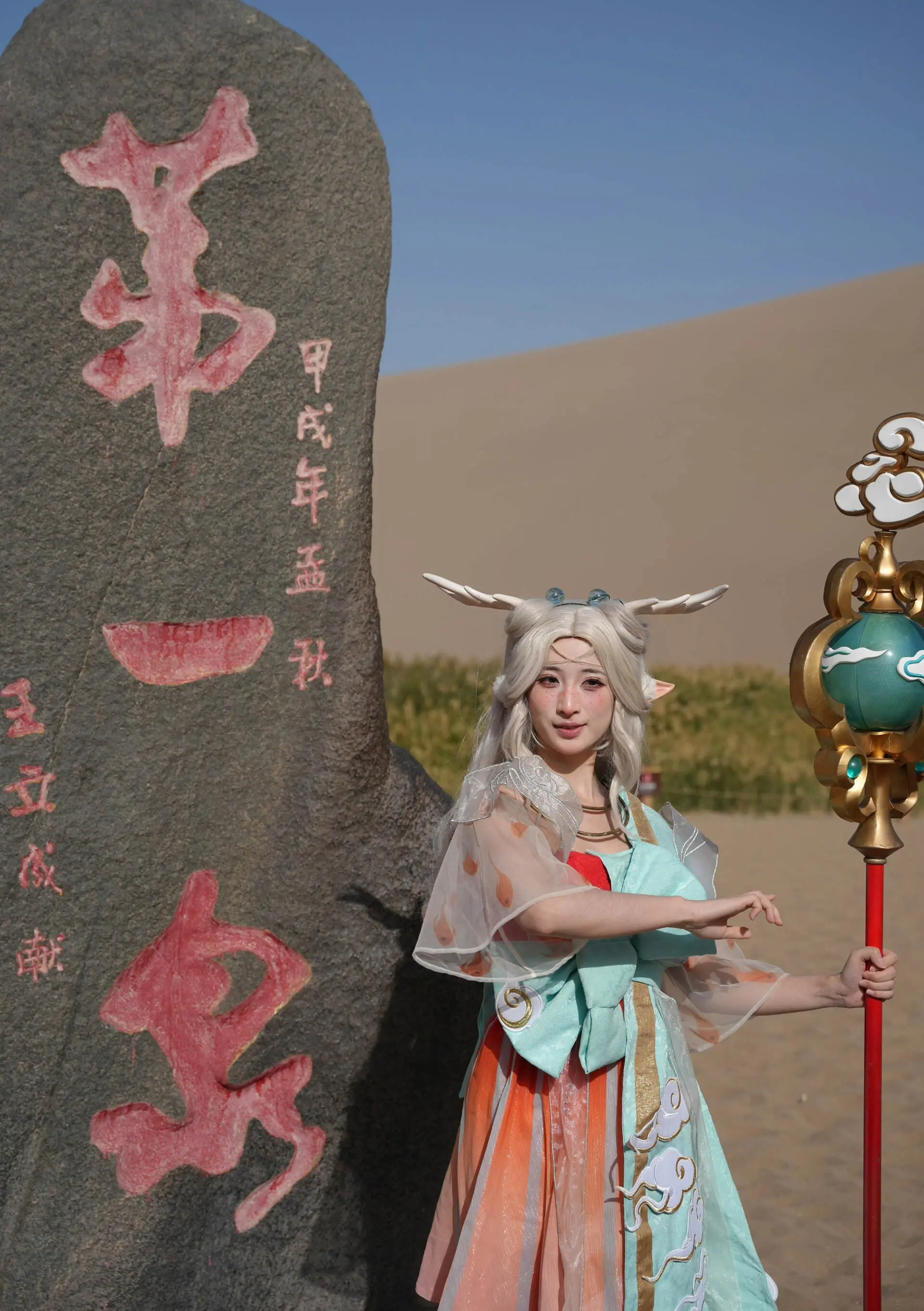 加上,她脸颊上粉红色的胭脂,看着特别的可爱。并且,上面这张图不知道是不是调了颜色的关系,显得她的皮肤超级白,颜值也就更好看了。她在敦煌的欢迎门那儿拍照,也是超级有象征意义的。