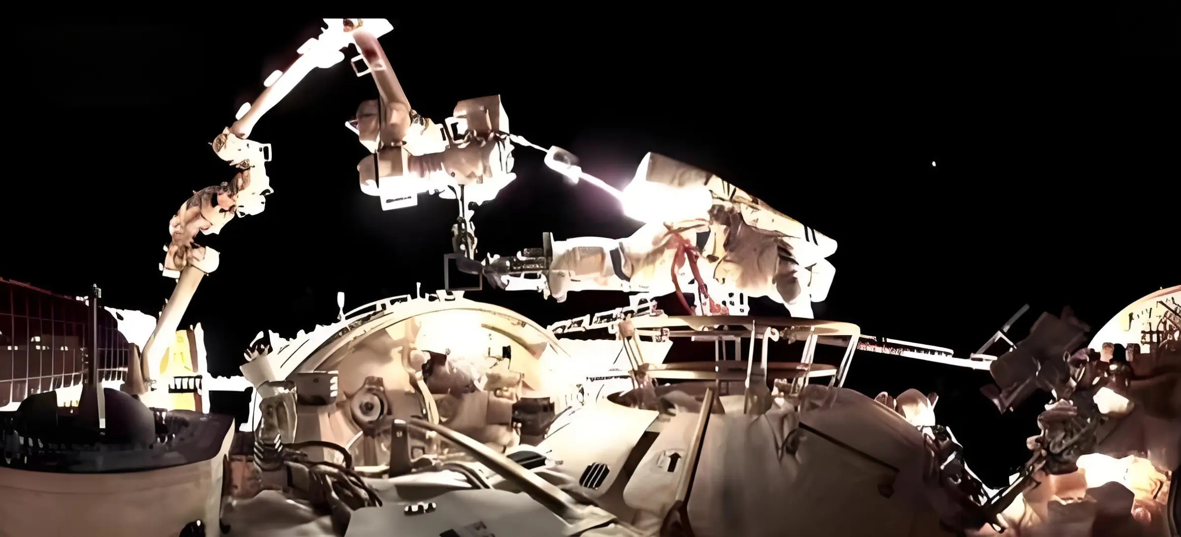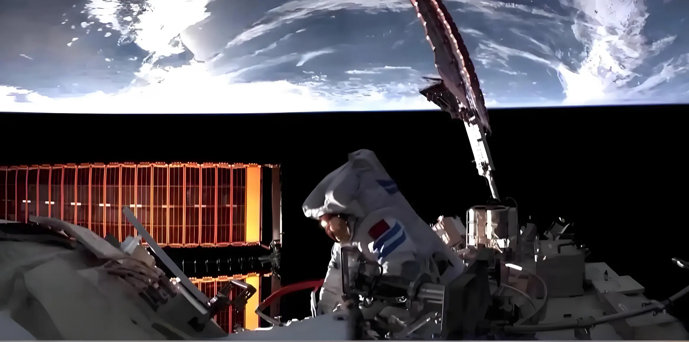 历经8小时紧张刺激的太空作业,当天18时45分,出舱航天员张陆和武飞圆满完成所有既定任务,安全返回问天实验舱气闸舱。