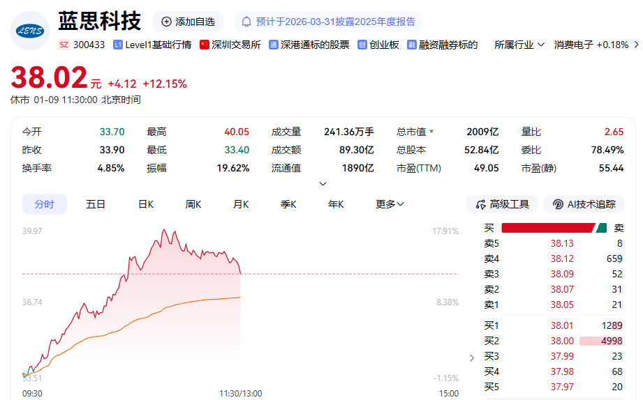 1月9日,蓝思科技A股盘中大涨,一度涨超18%。截至午间收盘,报38.02元/股,涨幅12.15%,换手率4.85%,成交额89.30亿元。